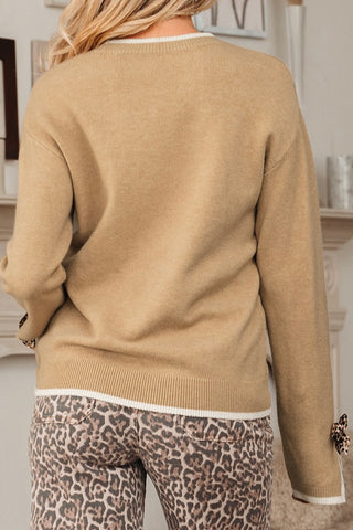 Playful meets polished in this statement-making sweater! The “Fashion Goals” Leopard Bow Top combines cozy tan knit with peek-a-boo leopard print cuffs tied into darling bows. The contrast trim neckline and relaxed fit give it that chic-meets-casual feel you’ll reach for every day — from coffee runs to fall get-togethers. Made to order: ready in approx 2 weeks.