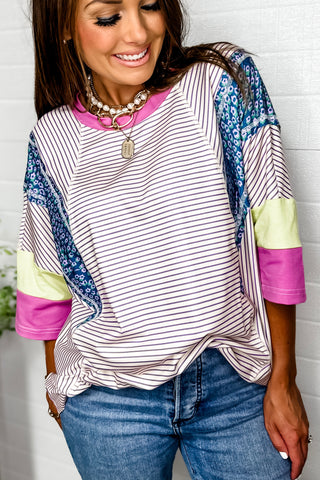 East coast charm meets playful personality. Designed with striped softness and bold patchwork sleeves, this relaxed-fit blouse blends a mix of florals, colorblock brights, and raw-edge details for a laid-back yet eye-catching look. Inspired by the breezy spirit of Cape Cod—think colorful cottages, salty air, and strolls along the shoreline—this top brings coastal fun into your everyday wardrobe. Several in stock and all others are made to order; ready in approx 2 weeks.