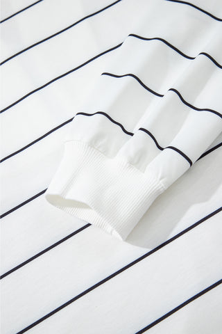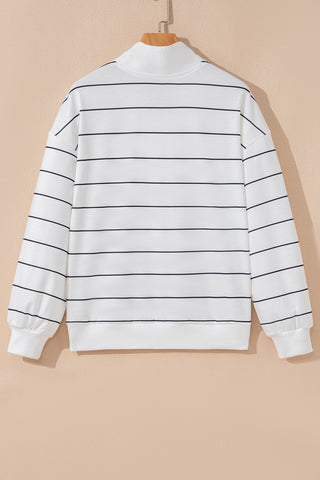 Classic stripes meet modern ease in this zip-front long sleeve top. With its casual drop-shoulder fit and half-zip neckline, it’s the perfect mix of polished and relaxed. Made to order; ready in approx 2 weeks.