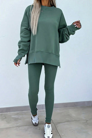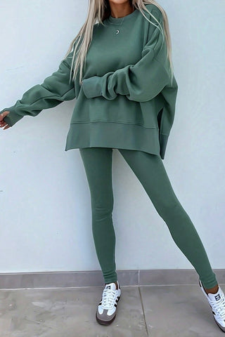 Minimal chic with everyday comfort! This two-piece lounge set includes a slouchy oversized pullover and matching ribbed leggings, perfect for errands, travel, or cozy days at home. Made to order; ready in approx 2 weeks.