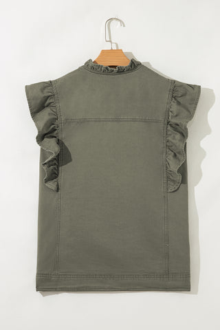 Utility meets femininity in this statement-making vest! Crafted in a rich olive denim, it features playful ruffle trim along the shoulders and a relaxed patchwork silhouette. Side pockets add function while metal button closures keep it effortlessly versatile. Made to order; ready in approx 2 weeks.