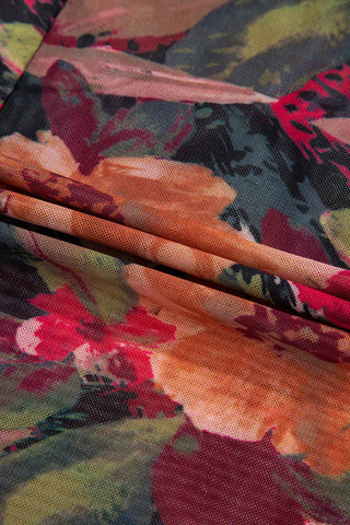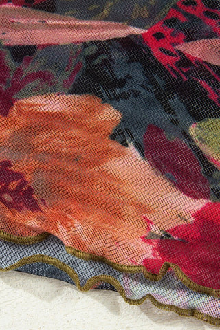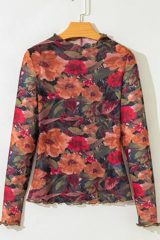 Bold florals meet sheer elegance! This long-sleeve mesh top features a striking multicolor floral print with delicate lettuce-trim edges for a feminine finish. Its lightweight, semi-sheer design adds a touch of allure while keeping it easy to layer with camis or under jackets. Made to order; ready in approx 2 weeks.
