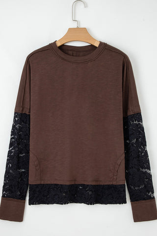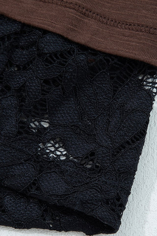 ✔ Deep coffee-brown base with soft black lace sleeves and hem for a chic layered look