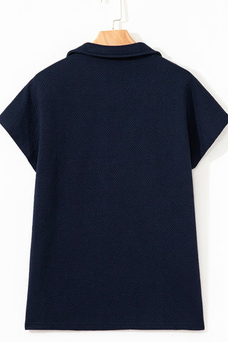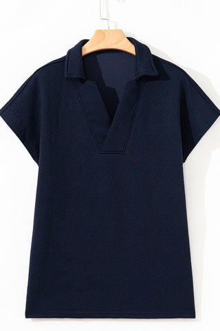 Timeless ease meets everyday chic! Crafted in a soft navy textured knit, this collared V-neck silhouette features short sleeves and subtle side splits for an effortlessly flattering drape. Whether paired with denim, trousers, or layered with a jacket, it’s the perfect versatile piece for casual days or polished evenings. Made to order; ready in approx 2 weeks.
