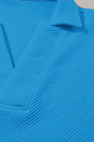 Timeless ease meets everyday chic! Crafted in a bright turquoise blue textured knit, this collared V-neck silhouette features short sleeves and subtle side splits for an effortlessly flattering drape. Whether paired with denim, trousers, or layered with a jacket, it’s the perfect versatile piece for casual days or polished evenings. Made to order; ready in approx 2 weeks.