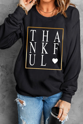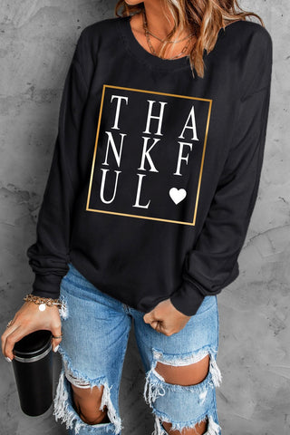 ✔ Timeless black crewneck with gold-framed “THANKFUL ♥” graphic — perfect for cozy fall days and Thanksgiving gatherings