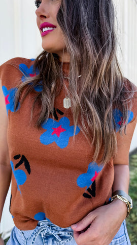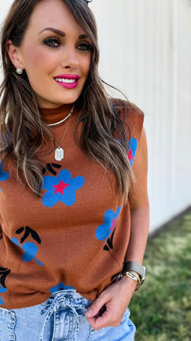Wear as a top or layered as a vest! Playful meets cozy in this chestnut knit sweater vest splashed with bold cobalt florals for a look that’s both trendy and timeless. The sleeveless design and high neck make it perfect for layering over crisp shirts, fitted turtlenecks, or even dresses for easy seasonal styling. Soft, breathable knit ensures all-day comfort while keeping your look polished and versatile. Made to order; ready in approx 2 weeks.
