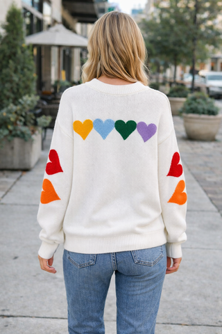A cozy white knit with cheerful rainbow hearts that pairs perfectly with denim, boots, or a mini skirt for Valentine’s fun, cozy coffee dates, or everyday feel-good style!