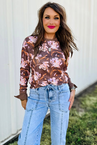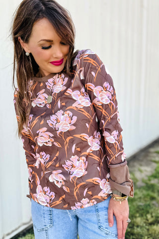 Effortless vintage vibes meet everyday comfort! This earthy brown waffle-knit top is splashed with soft blush and lavender florals for a sweet, feminine touch. Designed with a round neckline and slim, flattering fit, it’s perfect for layering or wearing solo as a cozy statement piece. Made to order; ready in approx 2 weeks.