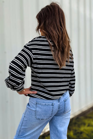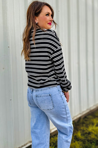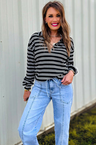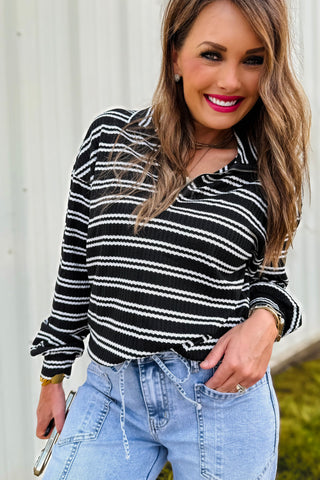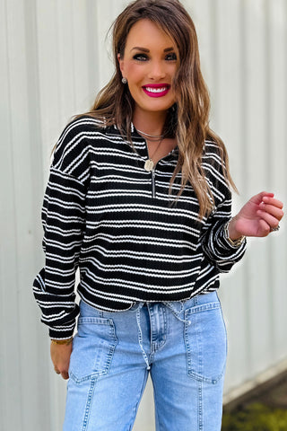 This pullover is your new go-to for casual days with a touch of charm! Featuring soft black-and-white textured stripes and a flattering quarter-zip neckline, it gives that “put-together without trying” vibe. The drop shoulder fit keeps it relaxed and comfy, perfect for layering over a tee or wearing solo on cool fall days. Made to order; ready in approx 2 weeks.