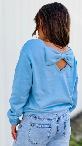 Soft charm meets playful detail! In a dreamy sky-blue shade, this sweatshirt keeps things cozy in front while surprising with a chic bow-back cutout. Its relaxed fit and long sleeves make it perfect for lounging in style, running errands, or dressing up casual weekends. Made to order; ready in approx 2 weeks.
