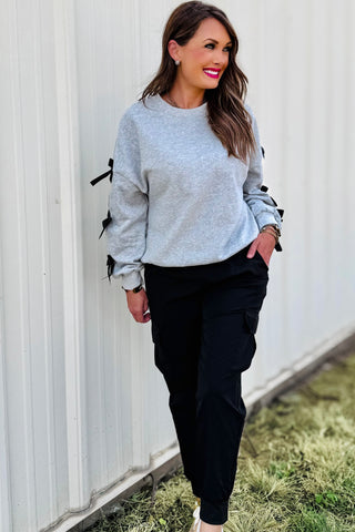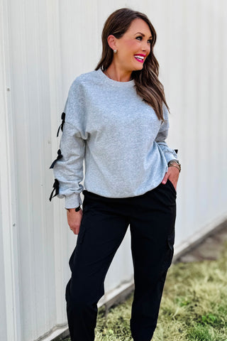 A touch of girly charm meets cozy comfort in this must-have fall sweatshirt! The Zoey features soft heather grey fabric with playful contrast bows down each sleeve — blending casual style with the sweetest feminine twist. Its relaxed, drop-shoulder fit makes it perfect for layering over your favorite jeans or leggings for an effortlessly chic look. Made to order; ready in approx 2 weeks.