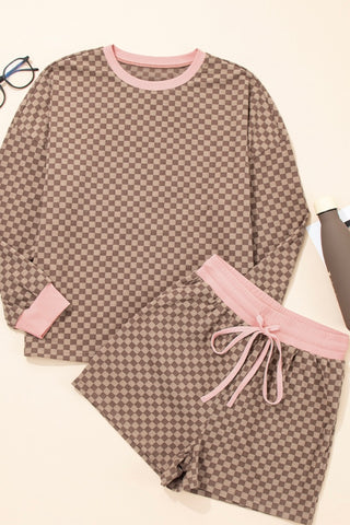 Playful pattern with cozy cool vibes! Designed with a relaxed-fit pullover and matching lace-up shorts, this two-piece set shows off a trendy checkered print in a soft sky-blue hue. Perfect for lounging, errands, or casual outings, it’s a chic mix of comfort and modern style that works all season long. Made to order; ready in approx 2 weeks.