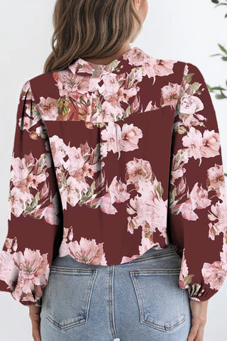 Feminine charm with timeless polish! This flowy brown blouse blooms with a soft floral print, designed with a button-up front, shirt collar neckline, and airy puff sleeves for the perfect blend of ease and elegance. Lightweight with a silky touch, it’s ideal for everything from office days to weekend outings. Made to order; ready in approx 2 weeks.